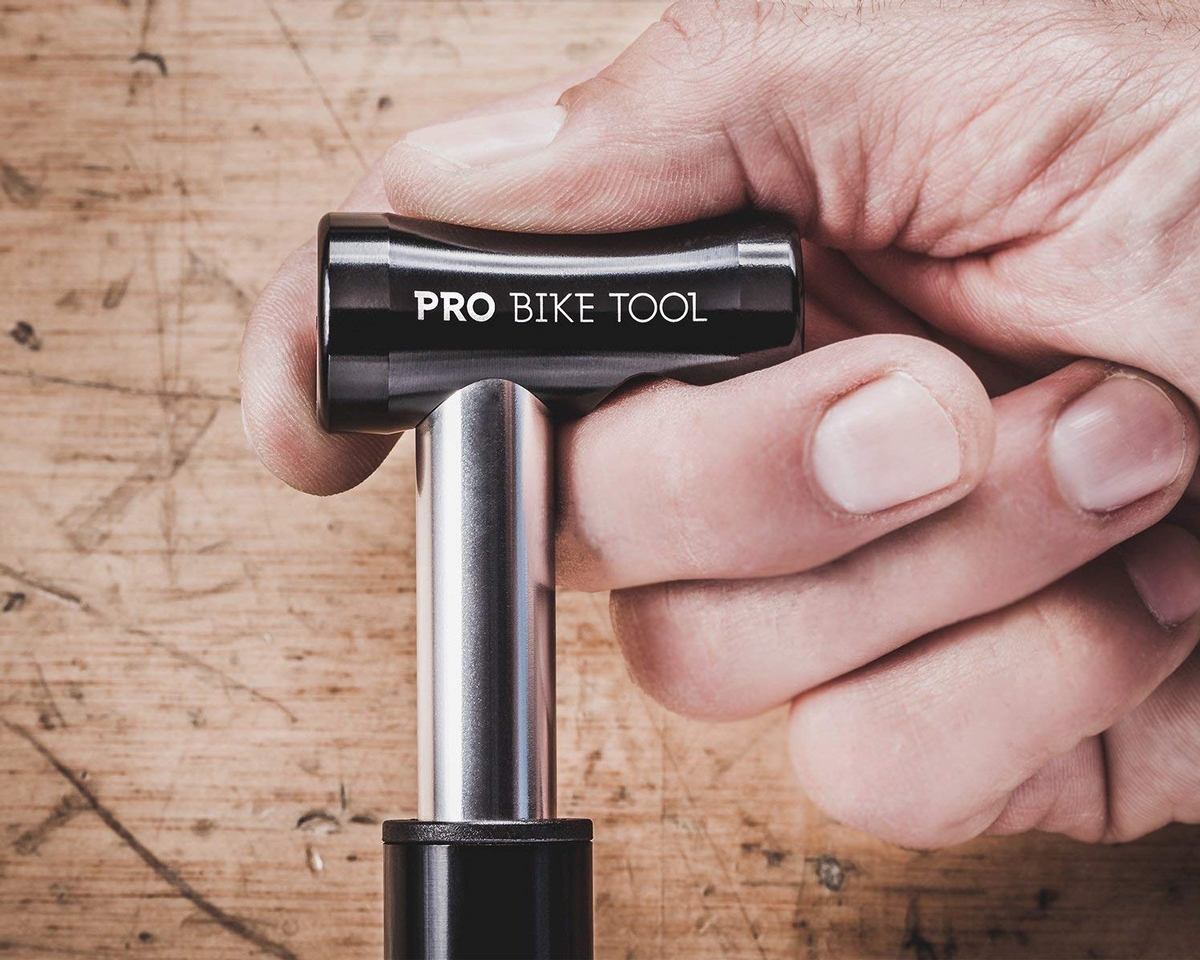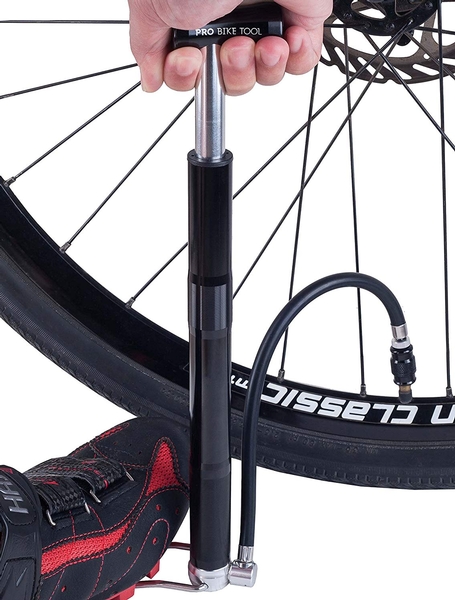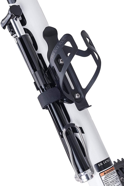 - EASY PUMPING - Ergonomic T-handle provides 'Great Grip and Pushing Power'. Stainless steel foot peg stabilizes the pump on the ground creating a comfortable and efficient pumping motion. Pump can either be mounted on a bike frame with the safe & secure frame mount bracket with extra security strap or stored in a pack / bag / pannier. Pre-drilled holes in bike frame required for installation of pump mount.