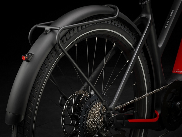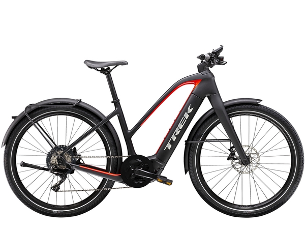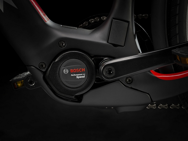 A sleek, high-performance carbon frame with a stagger geometry that fully encases a 625Wh battery—the longest-range Bosch offers—an ultra-powerful Bosch Performance Speed 350w drive system that helps you sustain speeds of up to 28 mph, and a SmartphoneHub controller that can be used with or without your phone. Plus, a 12-speed Shimano XT/SLX drivetrain, powerful 4-piston hydraulic disc brakes for all-weather stopping power, an integrated front and rear lighting system, fenders, and a rear rack.