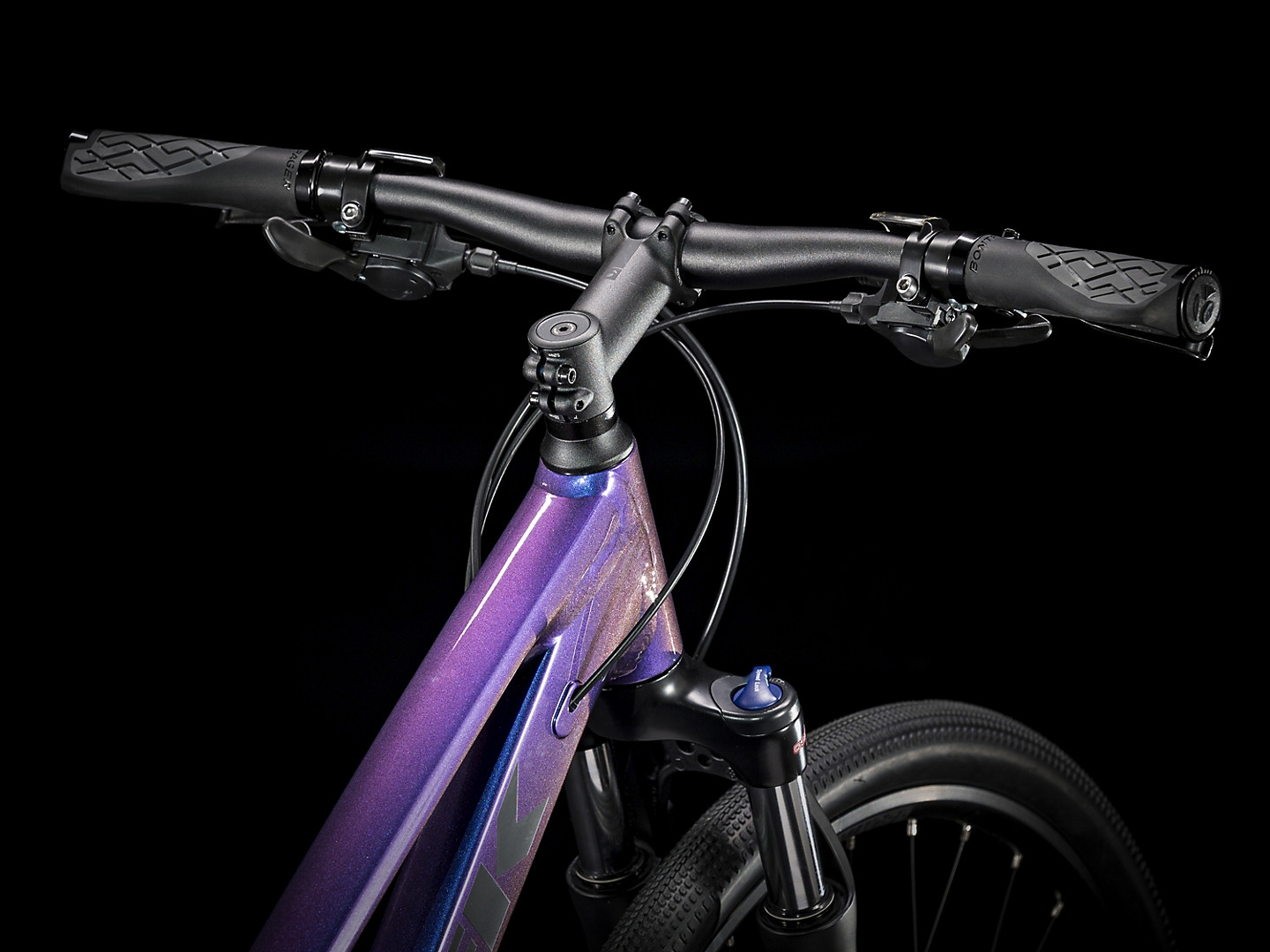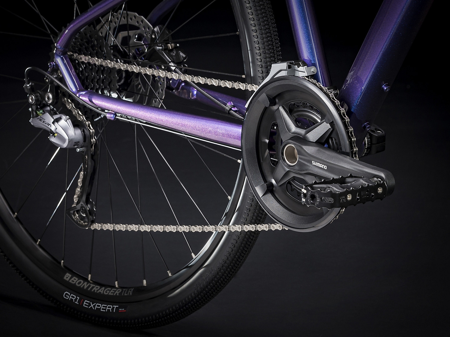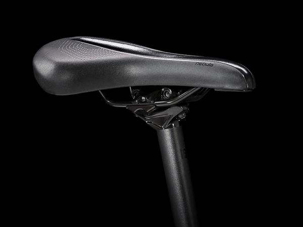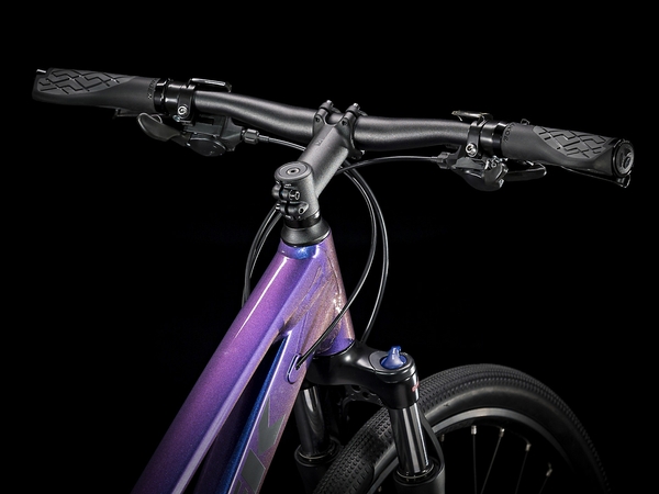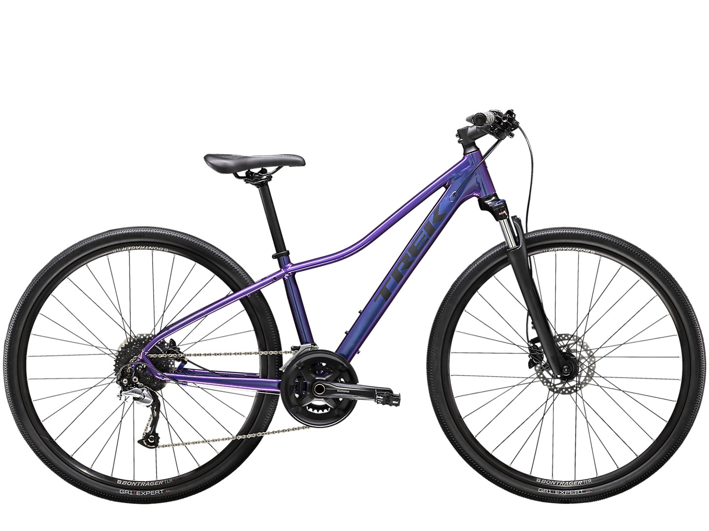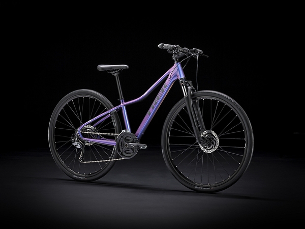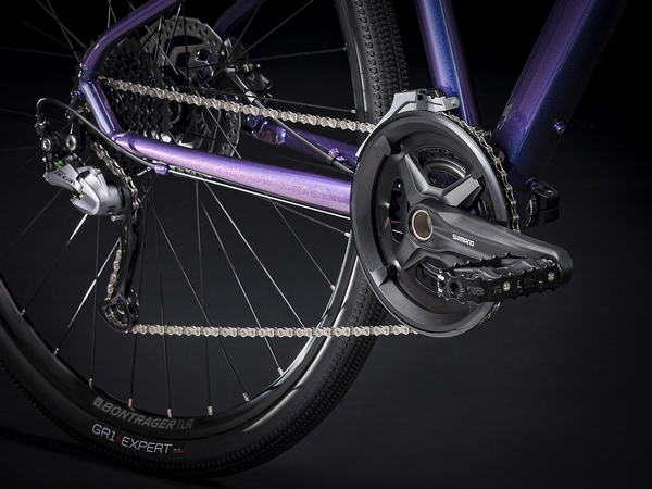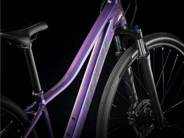 A lightweight Alpha Gold Aluminum frame with internal cable routing and a sloping top tube for easy mounting and dismounting, an SR Suntour NEX fork with a lockout feature, an upgraded 2x9 Shimano drivetrain with a wide range of gearing, Shimano hydraulic disc brakes for all-weather stopping power, Tubeless Ready rims, puncture-resistant Bontrager GR1 Expert Hard-Case Lite tires, a Bontrager H1 Women's saddle, rack and fender mounts, ergonomic grips, DuoTrap S compatibility, and a Blendr stem for easy accessory integration.