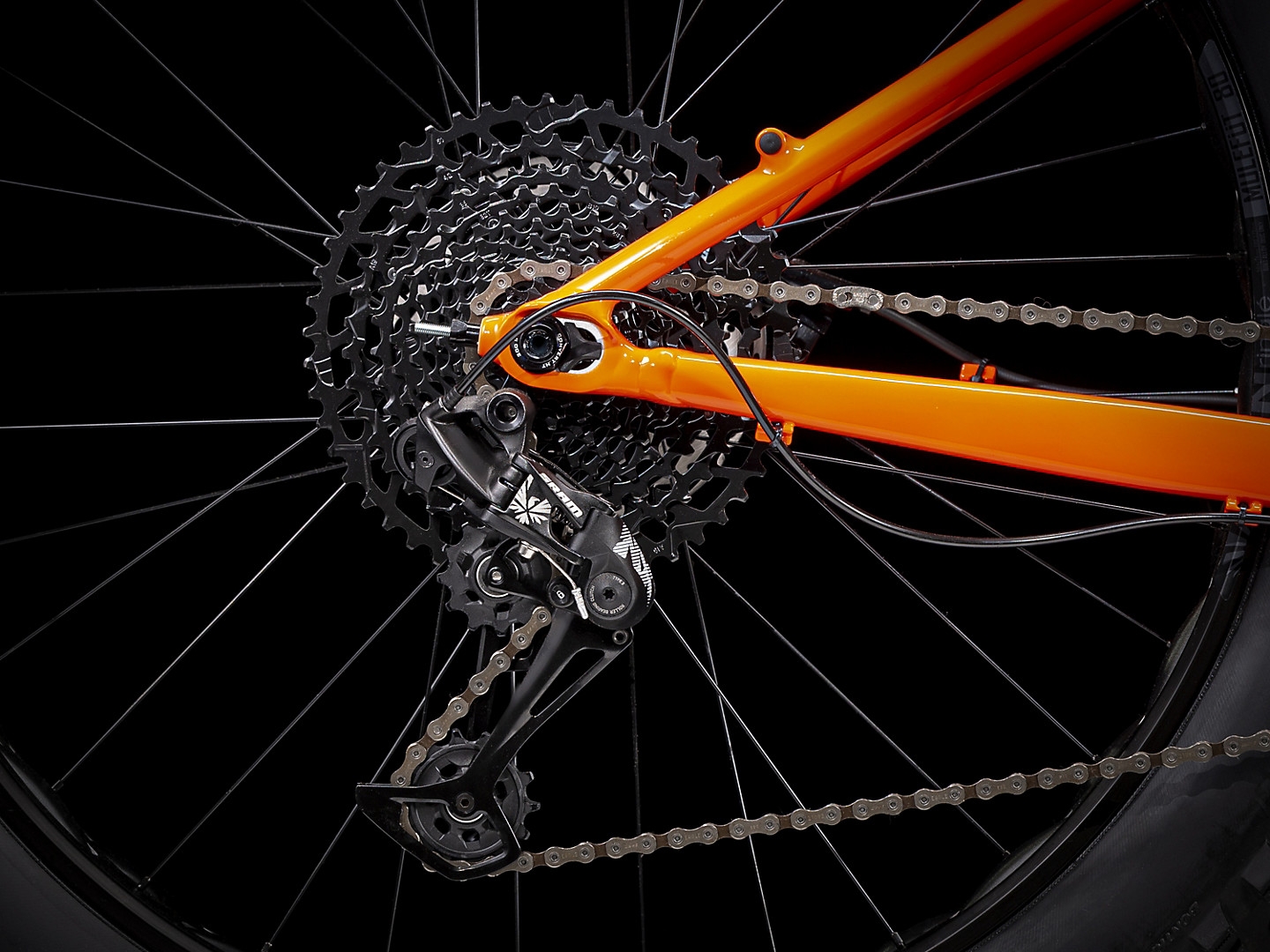 A lightweight Alpha Platinum Aluminum frame with Stranglehold dropouts, an 80mm Manitou Mastodon suspension fork with an air spring and lockout feature, a wide-range SRAM NX/SX 1x12 drivetrain, SRAM Level T brakes, a dropper post, and SUNringlé Mulefüt wheels paired with a 108T Rapid Drive hub for instant engagement, and extra-grippy 27.5x4.5? Bontrager Gnarwhal TLR tires.